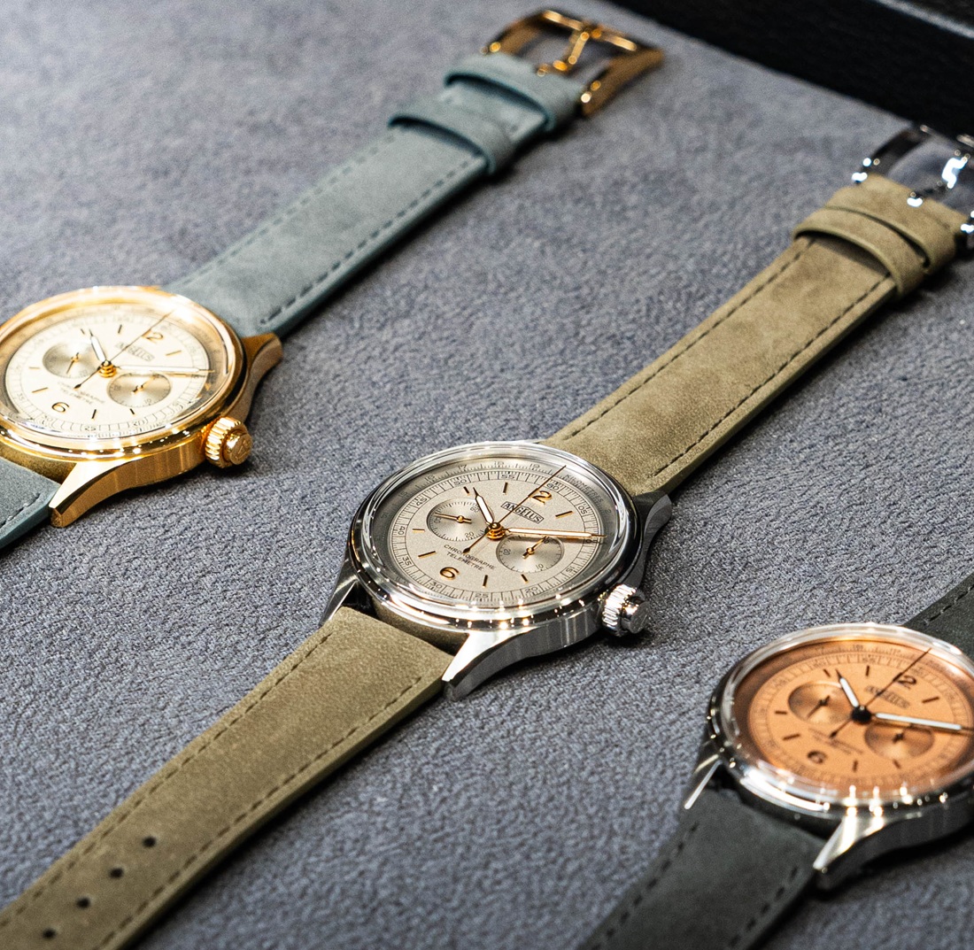 Completing the presentation are premium calfskin straps available in steel blue, anthracite grey, or sage green, each fitted with a pin buckle matching its case material. The watch also offers 3 bar water resistance and features a box sapphire crystal with anti-reflective coating on both sides, balancing durability with refined aesthetics.