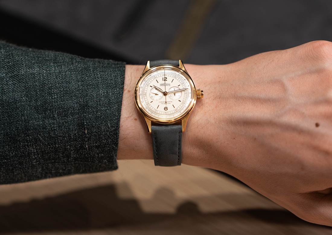 Powering the watch is the in-house A5000 calibre, a manual-winding movement that exemplifies Angelus’ ongoing commitment to mechanical artistry. This integrated mono-pusher chronograph operates at 3 Hz and incorporates a column wheel with a horizontal clutch—mirroring the technical configurations seen in historic chronographs from the 1940s through the 1970s. At just 4.20 mm thick, the movement fits the case with exacting precision. Its visual construction enhances its appeal through a two-tone finish featuring 3N gold-finished bridges and mainplate contrasted by palladium-coated chronograph components. Geneva stripes, circular graining, polished screws, and pronounced bevels reveal the level of craftsmanship visible through the sapphire exhibition back.
