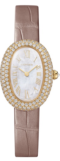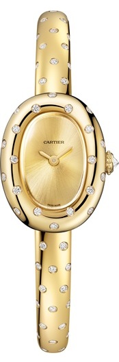 For those drawn to natural beauty, the Baignoire with a mother-of-pearl dial captures the ever-changing shimmer of the sea. Enhanced by 227 diamonds, its iridescent surface reflects light in mesmerizing ways, paired with gold-finish details that radiate warmth and refinement.