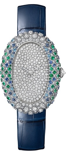 In the Color Signature model, Cartier showcases its daring artistry with a nod to Louis Cartier’s famed “peacock motif.” The bezel comes alive with 170 diamonds, 58 sapphires, 54 emeralds, and 16 aquamarines, arranged in varying heights to create dynamic relief. At its center, 262 snow-set diamonds ignite the dial, while the blue alligator strap and diamond-set buckle complete this vivid display of color and craftsmanship.