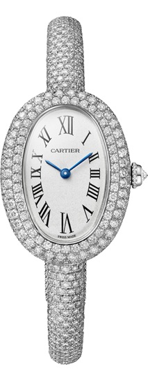 Among the most captivating is the Baignoire mini bangle watch, a creation that fuses precision and poetry. Set with 436 brilliant-cut diamonds on the bracelet and 212 more on the case, this radiant piece is a triumph of craftsmanship. The grained silvered dial with anthracite Roman numerals and blued steel hands gleams beneath a domed sapphire crystal, while a single diamond on the crown provides the final touch of Cartier’s signature elegance.