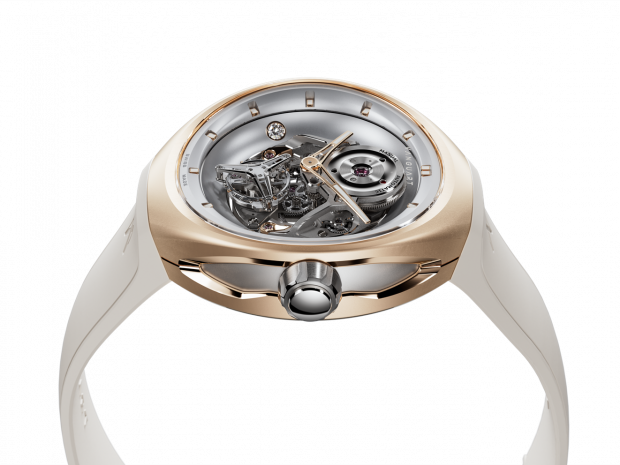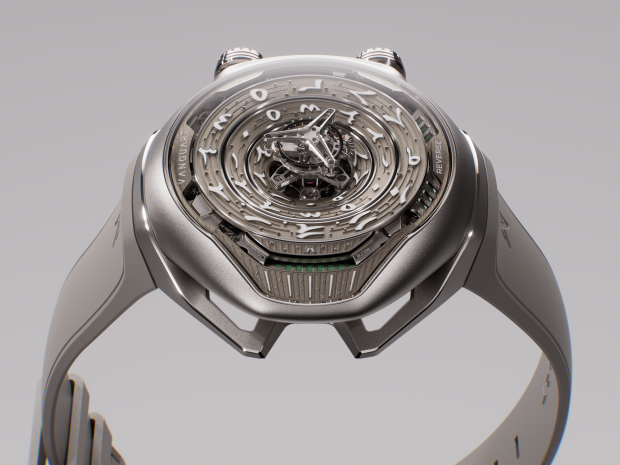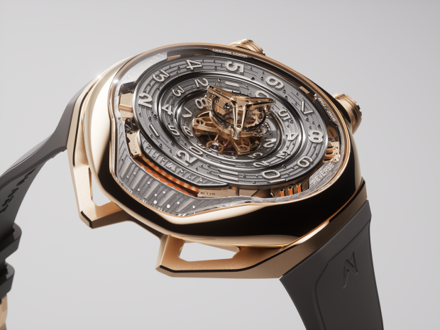 Debuting in 2021, the 43 mm Black Hole Tourbillon runs at 3 Hz and offers a 42-hour power reserve. Its cosmic-inspired design was strikingly original, featuring two crowns: the lower for adjusting time forwards and backwards, and the upper for advancing the hours only. The black-coated titanium edition retailed at CHF 290,000, while the rose-gold and platinum versions commanded CHF 320,000.