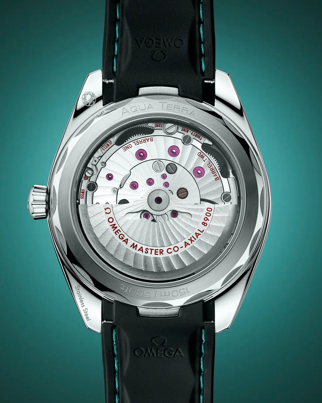 The design remains unmistakably Aqua Terra, showcasing signature features such as the distinctive wave-edged caseback, screw-in crown, and domed sapphire crystal treated with anti-reflective coating on both sides.